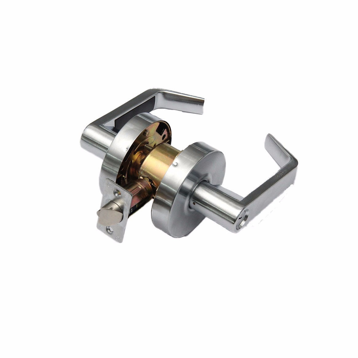 門內無轉鈕,不能反鎖,鎖舌被鎖住時,門外通過鑰匙開鎖,門內執手常開.